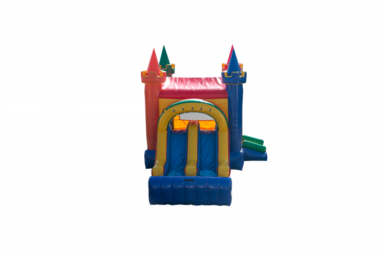 Bounce Castle Combo Dual Slide With Hoop. Large Bouncing Area With Baseketball Hoop and Double lane slide.